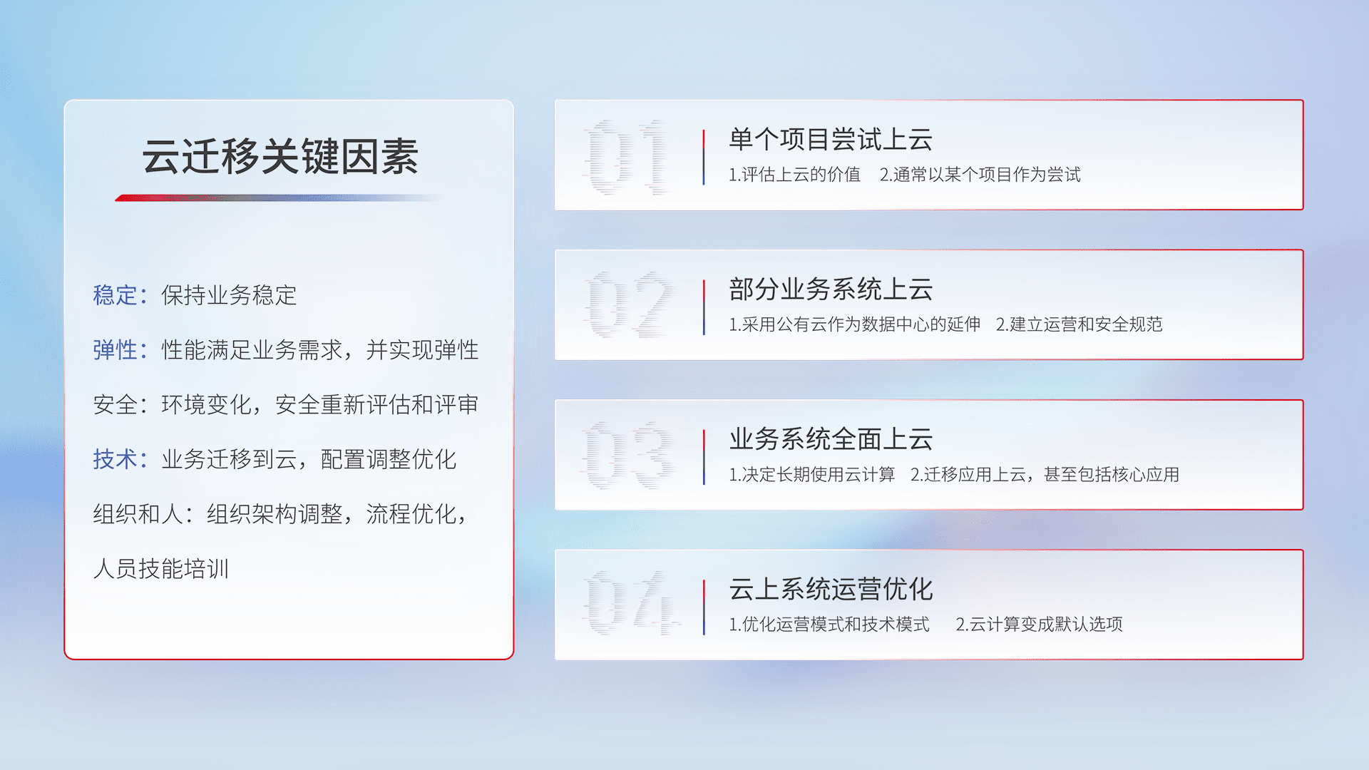结合实际业务,,,从规划设计、、、云平台选型、、、、云原生改造、、数据迁移、、集成交付,,,迁移全过程为客户识别最佳上云路径,,做好风险识别管理,,,设计网络架构、、、、身份权限、、安全审计合规、、、操作审计、、、日志审计、、监控告警策略、、多站点容灾设计等,,,对云上基础设施进行整体规划,,提升IT治理水平,,,,以满足弹性、、高可用、、、、高性能的需求。。
