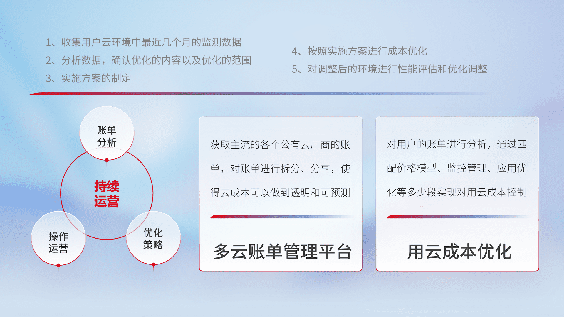 通过多云纳管,,,以统一的资源数据模型把客户的云资源进行抽象和封装,,,进而实现对多云资源的统一操作,,,保障云资源管理的可靠性、、、稳定性与可用性。。。。量身定制化运维内容,,,配置、、、、开发运维、、、、补丁管理、、、、备份、、监控、、、、认证和访问管理、、、审计和日常巡检等,,保障在用云过程中的可靠度,,,,稳定度以及高可用率。。。。